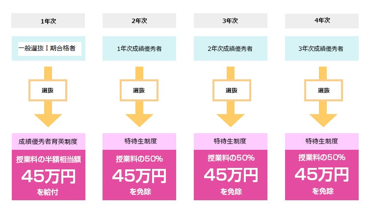 また、2年次以降(4年次まで)については、授業料の半額を免除する特待生制度(※)があり、大学入学後、さらに集中して勉学に打ち込めるよう、経済面で強力にバックアップします。