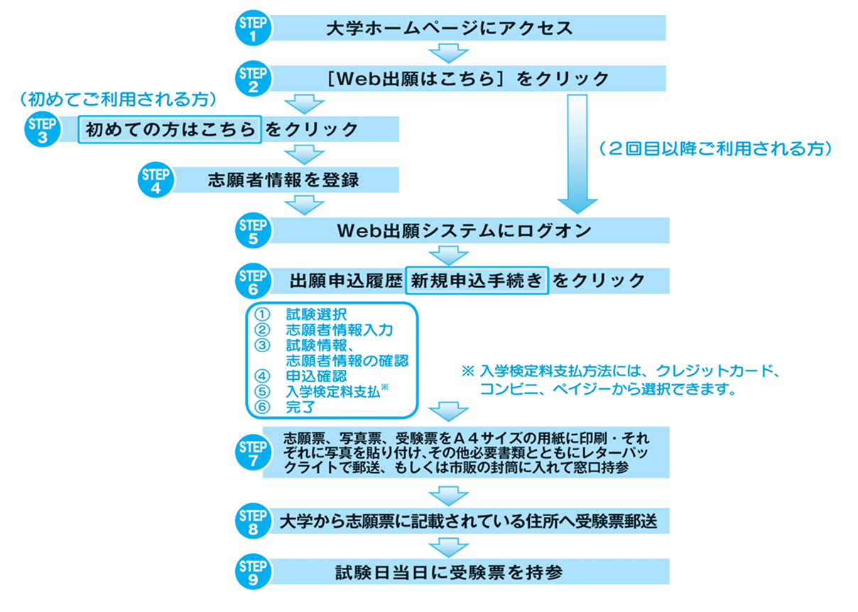 ②入学検定料の納入、すべての出願書類が出願期間内に提出されたものについて受け付けいたします。Webで出願登録を完了しただけでは出願したことにはなりません。出願期間中に全ての書類を本学宛に送付(もしくは持参)していただいて「出願」となりますので、ご注意ください。
