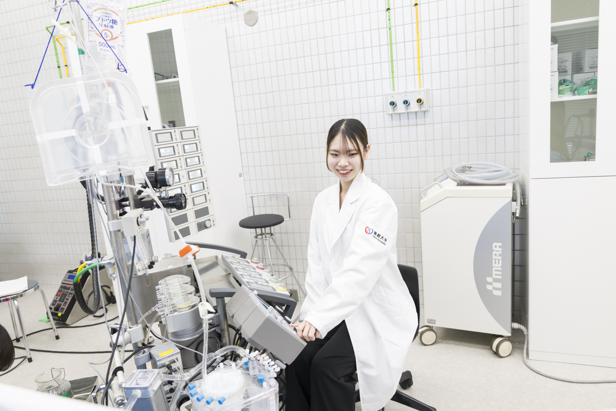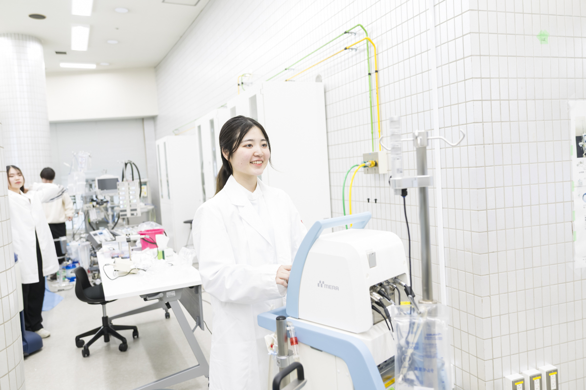 生命維持管理装置を使用する実際の医療現場の見学は、緊張感が高まるとともに自身の目指す資格に誇りとやりがいを見出すことができる貴重な体験です。もちろん資格の取得前のため実際の操作を行うことはできませんが、4年次までに学んだ講義の知識と実習の技術を実際の医療現場で活かすことができるか、自分自身で確認し自信をつける機会です。適切な指導者の下で医療機器の保守管理と患者とのコミュニケーションが体感でき、心身ともに充実した時間を過ごすこととなります。