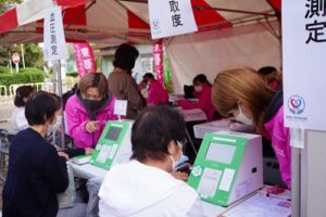 血圧測定、野菜摂取状況測定・血圧測定は学生と教員が手動で行いました。・野菜摂取状況測定は、指を置いていただくだけで簡単に野菜の摂取状況がわかる機械を用いて、不足している野菜がわかります。