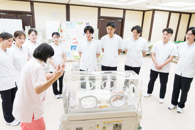 リプロダクティブヘルス看護学では、思春期から妊娠期・分娩期、産褥期にある母親と新生児、家族を対象とします。内容は、陣痛が始まり子宮口が全開まで産痛を和らげるためのケア、出産後の育児に必要な資料作成や保健指導が含まれます。新生児は、体温・呼吸・心拍数を計測し、授乳を観察することで健康状態をアセスメントし、母児の安全と健やかな成長を支えるための知識と技術を学びます。
