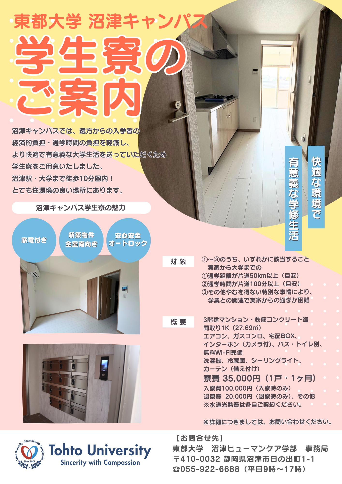 入寮については、チラシに掲載している「対象」に該当する入学手続者に対して優先的にご案内する予定です。